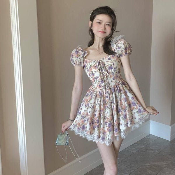 Abito da donna a maniche corte in pizzo con maniche francesi a sbuffo