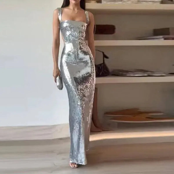 Fionda di paillettes Colletto quadrato senza schienale Abito gonna