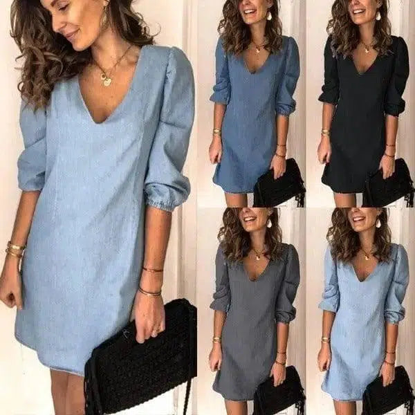 Abito casual allentato in cotone e lino con scollo a V e maniche corte