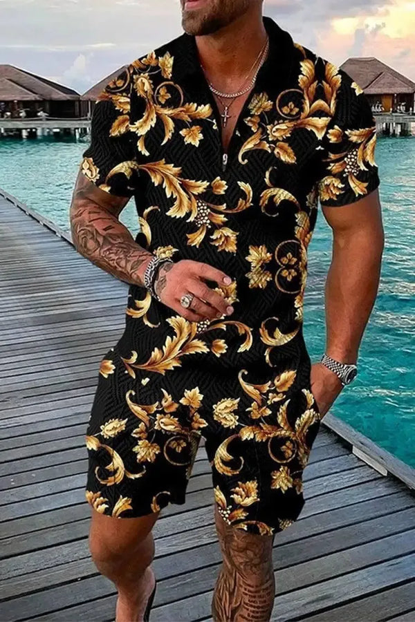 Descrizione del prodotto: Uomo Moda Stampa Risvolto Cerniera Due Pezzi Tuta