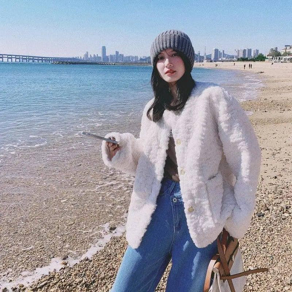Collo rotondo Fibbia metallica Pelliccia di coniglio Cappotto donna