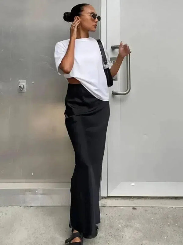 Gonne donna nere eleganti in raso Moda Slim Quattro Stagioni