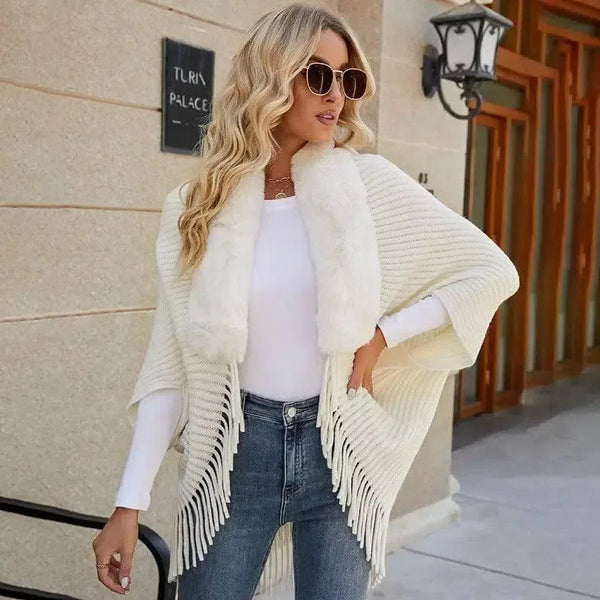 Scialle da donna con collo di pelliccia e nappe lavorato a maglia
