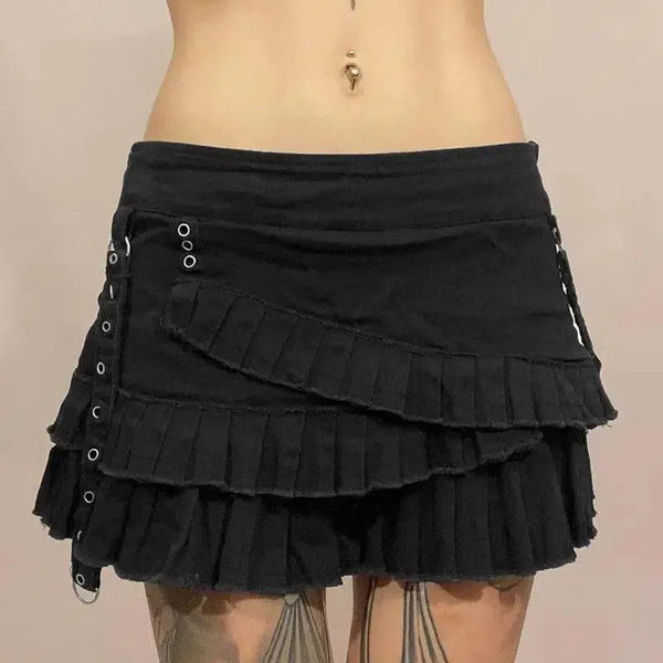 Gonna di jeans a pieghe irregolari con fibbie metalliche