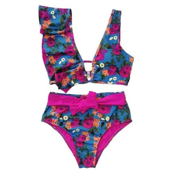 Costume da bagno bikini asimmetrico con volant a vita alta