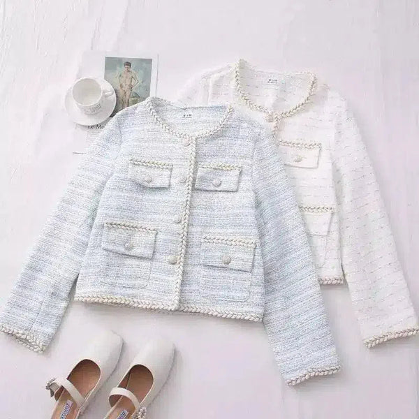- Colore e fantasia: Colore azzurro e bianco con una sottile texture Dettaglio aggiuntivo: Rifiniture a contrasto lungo i bordi e le tasche