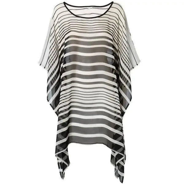 - Tessuto: Chiffon leggero per una sensazione di leggerezza. Modello: righe bianche e nere per un look senza tempo .