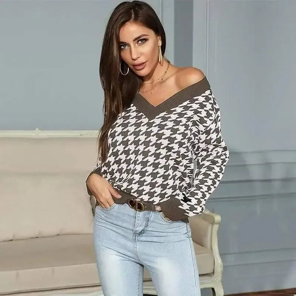 Donna Maniche lunghe in pied-de-poule jacquard con scollo a V in maglia