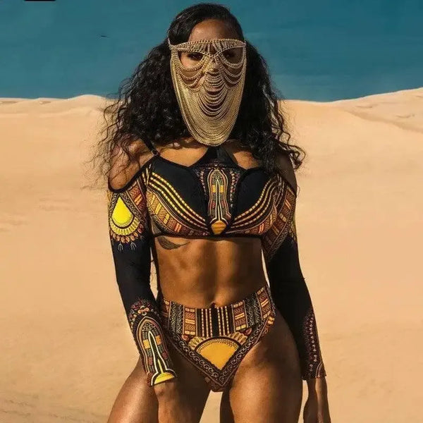 Bikini due pezzi a vita alta stampato a maniche lunghe da donna