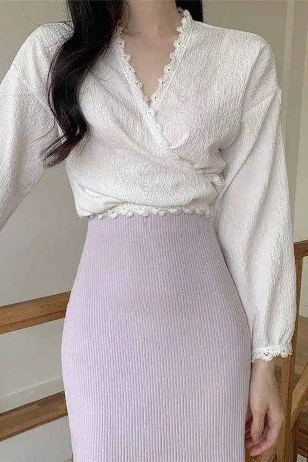 Camicetta con scollo a V in pizzo e gonna a tubino in maglia