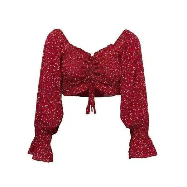 Crop top floreale a maniche lunghe con lacci e lacciuoli