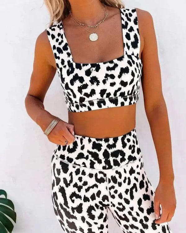 Questo elegante crop top è caratterizzato da un audace design leopardato, perfetto per un look sportivo e di tendenza.