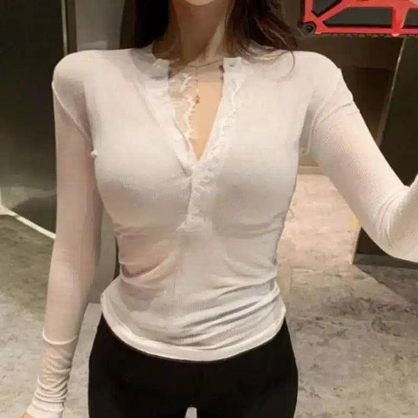 Top da donna a manica lunga in pizzo trasparente