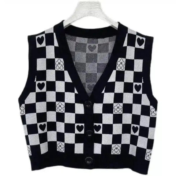 Gilet a scacchiera in maglia con bottoni sul davanti