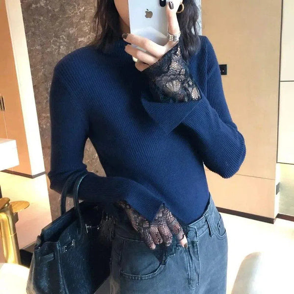 Maglione dolcevita a coste con polsini in pizzo