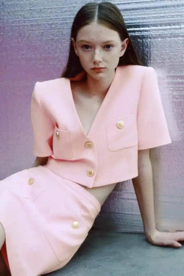 - Dettagli Dettagli: Bottoni dorati e tasche frontali su top e gonna