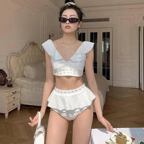 Bikini con volant, arricciato, senza schienale e con spacco a vita alta