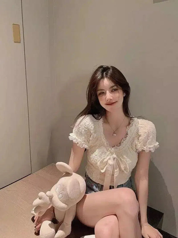 - Vestibilità: Maniche corte con dettagli di volant Vestibilità: aderente con chiusura frontale a lacci .
