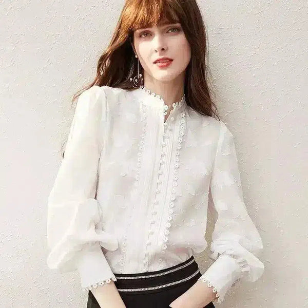 - Bordi smerlati delicati - Le maniche e il colletto sono rifiniti con bordi smerlati, che contribuiscono al look intricato e raffinato della camicetta.
