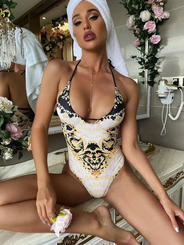 - Stile: Costume intero con stampa retrò e silhouette da bikini .