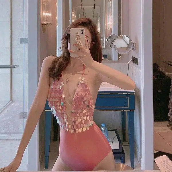 Paillettes Backless Deep V Gathered Moda Halterneck