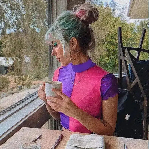 - Colletto: Maniche corte con dettaglio di volant. Scollatura: Scollo alto con collo alla coreana