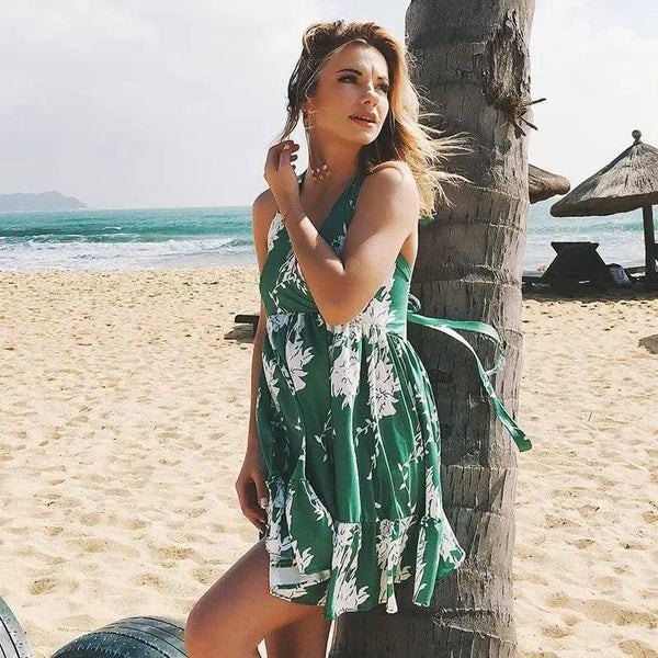 Abito da spiaggia senza maniche con scollo a V e stampa Halter