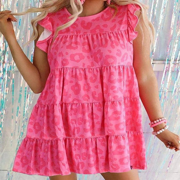 Mini abito estivo con stampa leopardata e scollo rotondo con volant
