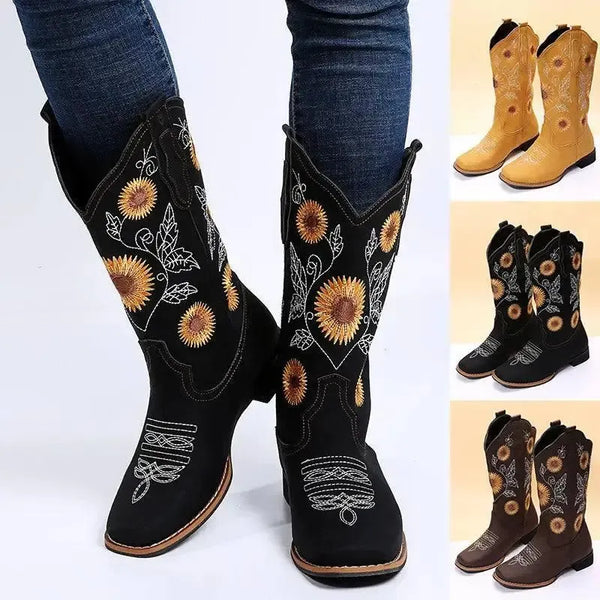 Stivali da cowboy Donna Scarpe da ricamo a girasole Tacco basso