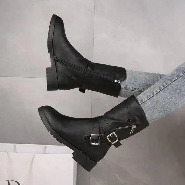 - Design: Stivali Martin alla moda con un accento di fibbia alla cintura .