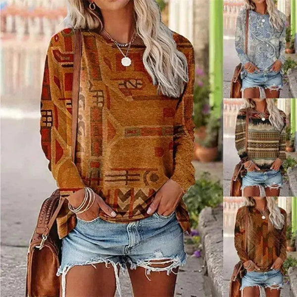 Top donna stampato a maniche lunghe con scollo rotondo