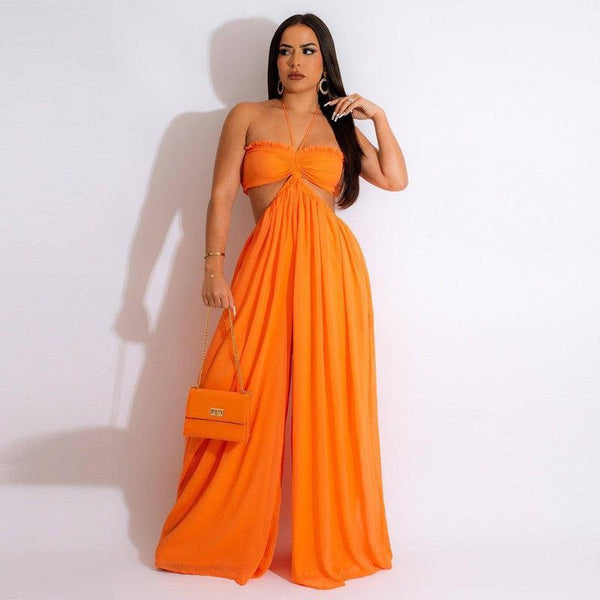 Tuta a gamba larga in chiffon con petto avvolto e schiena nuda europea