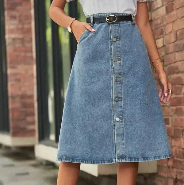 - Design: Gonna in denim lavato con un elegante dettaglio al seno Design.